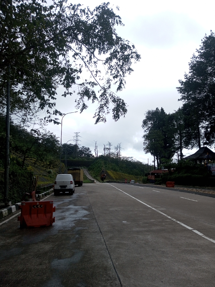 This image captures an overcast daytime scene on a paved road in Deothang, Bhutan. The concrete road surface, featuring white solid and dashed lane markings, displays scattered wet patches. In the immediate foreground on the left shoulder, an orange plastic road barrier with black chevron arrows is visible. Further along the left shoulder, a white van is parked, facing away from the viewer, followed by a partially obscured light-colored truck. A streetlight pole stands adjacent to the vehicles. The left side of the road is bordered by a concrete curb and a retaining wall, supporting a steep, forested hillside. Power transmission lines and multiple lattice towers are visible atop the distant hills. On the right side of the road, nestled among dense trees, is a dark-roofed structure with an ornate, multi-tiered roof. Another orange barrier is positioned on the right shoulder further down the road. Two small, light-colored vehicles are discernible on the main road in the far distance. The sky is uniformly overcast and grey. No individuals are visible in the frame.