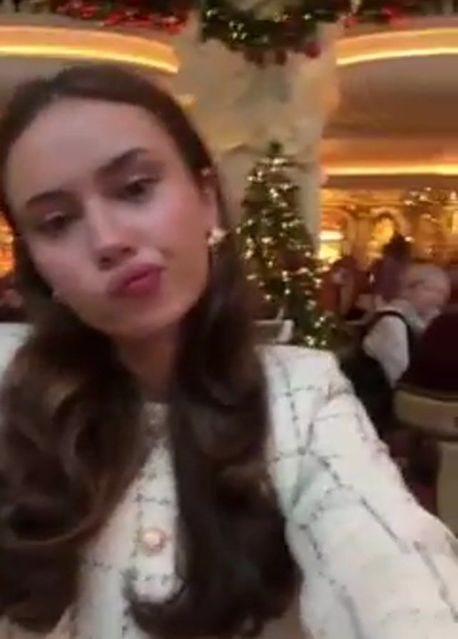 A woman is recording a short video of herself in a crowded restaurant. The restaurant is decorated for the holidays with garlands and a Christmas tree. The woman is wearing a white and black tweed jacket and has long brown hair. She smiles and sticks out her tongue at the camera. Other people are visible in the background, sitting at tables and being served by staff. The video is shot from a first-person perspective.