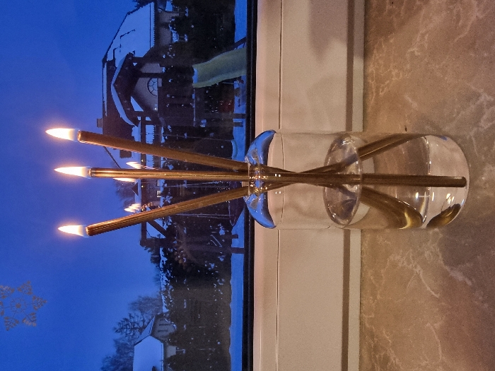 The image displays an indoor-outdoor scene during a winter twilight. In the foreground, positioned on a light brown speckled countertop or window sill, a clear cylindrical glass vase is approximately half-filled with a transparent liquid. Five slender, golden-hued metallic rods are vertically arranged within the vase, converging at the top where they are held by a translucent blue, curved fixture. Each rod's upper tip emits a bright, steady flame. A white window frame separates the indoor setup from the outdoor environment. Outside, the sky is a deep twilight blue. The ground is uniformly covered in snow, with various trees, some bare and some evergreen, visible. A prominent feature in the midground is a snow-dusted wooden children's playset, including a swing structure and a yellow slide. To the right, a multi-story residential house with a snow-covered gable roof and light-colored walls is visible. A faint, star-shaped object is adhered to the upper left pane of the window. No individuals are present. The specific location within Riga, Latvia, is not discernible from the architectural styles or landmarks depicted.