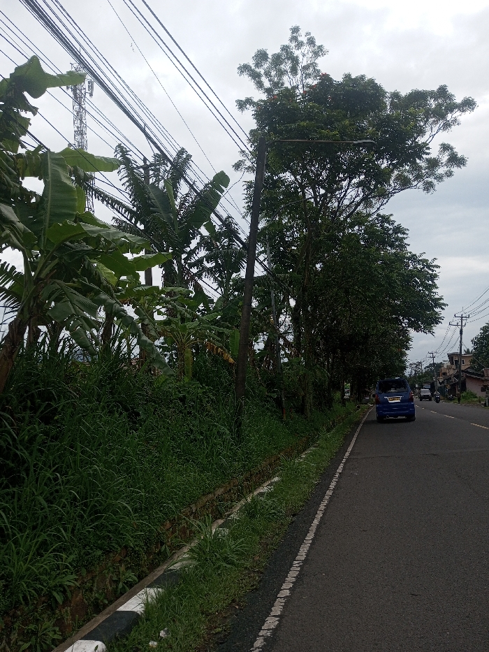 A road curves through a landscape abundant with foliage. Banana trees and tall grasses flourish on one side, contrasted by a strip of asphalt and a roadside ditch. A blue vehicle travels down the road, followed by distant smaller vehicles. Overhead, a network of utility lines intersects a cloudy sky, with a communication tower visible in the background amidst the dense greenery. A tall tree with a street lamp stands prominently along the roadside.