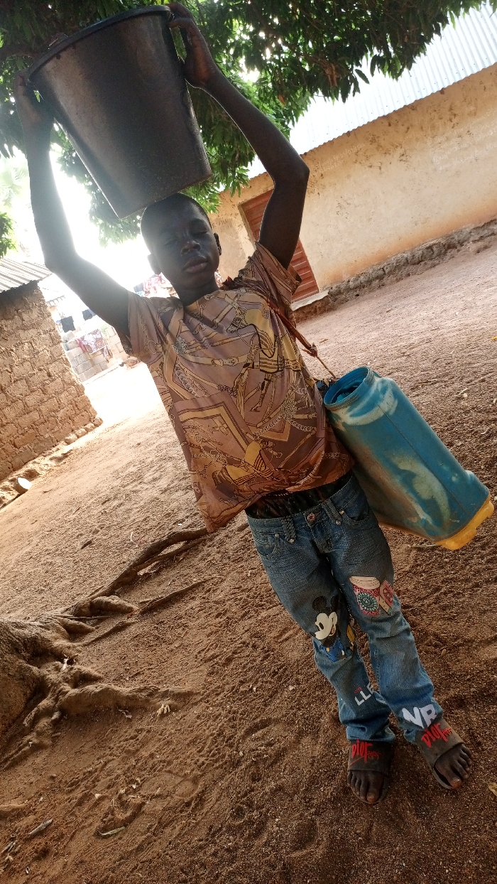 A young person balances a black bucket on their head with arms raised. Dressed in a patterned shirt and jeans with cartoon patches, they wear sandals. A blue container hangs from their shoulder. The setting appears to be a rural or impoverished area, with sandy ground and simple structures in the background. Trees are visible overhead.