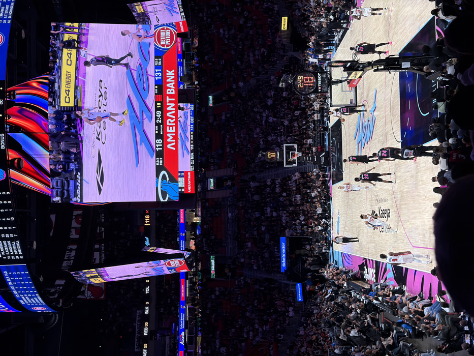 A basketball game in progress inside Kaseya Center. The Miami Heat is playing against the Detroit Pistons. The scoreboard shows Miami leading 118 to 131 with 2:49 left in the 2nd quarter. Players in Heat jerseys are lined up on the court. The audience fills the stands. Advertisements for C4 Energy and Amerant Bank appear on the digital signage. A Tissot scoreboard hangs above the court.