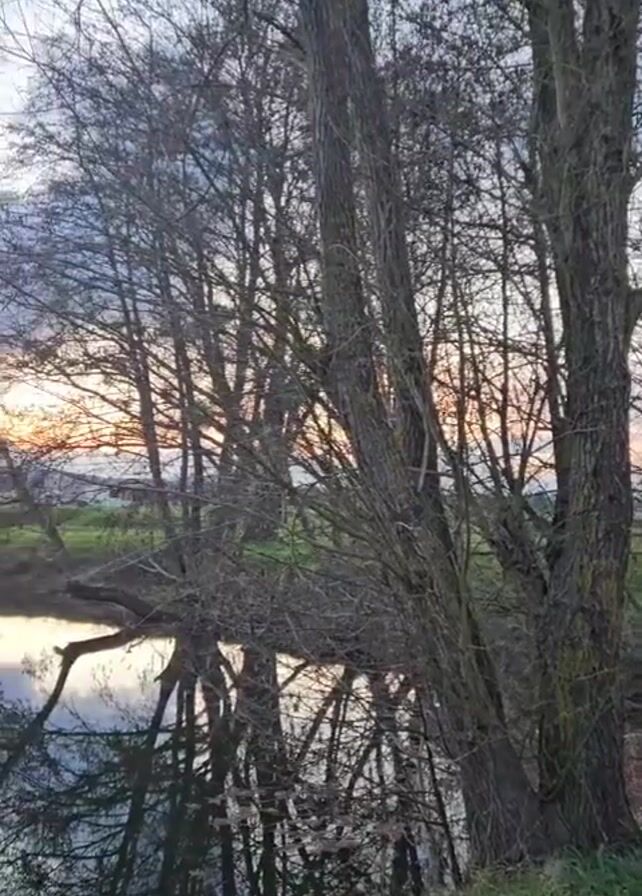 still shot of a tranquil pond surrounded by bare trees. The sky above is a gradient of colors from blue to orange, indicating a sunset or sunrise. The still water of the pond perfectly mirrors the trees and sky, creating a symmetrical composition. In the distance, there is a plume of white smoke rising, possibly from a factory or power plant. The foreground is filled with grass and the base of the trees.
