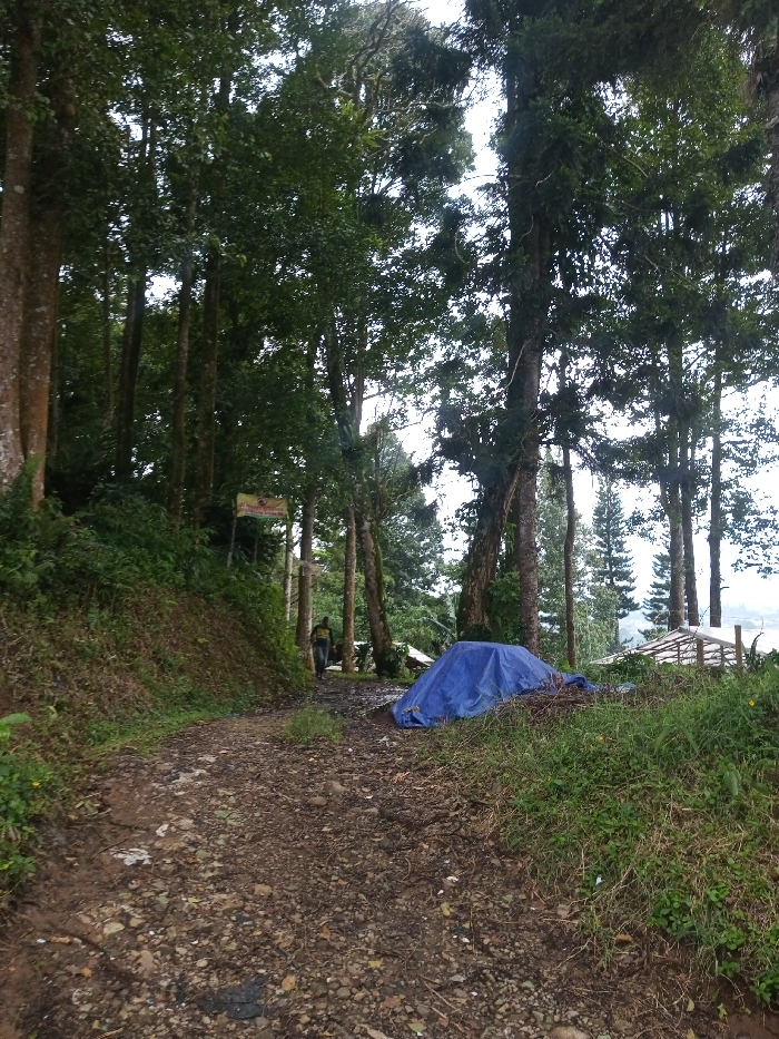 The scene depicts a forested, rural pathway in Hasanparthy mandal, India. A rocky dirt path traverses the foreground and mid-ground, bordered by dense green undergrowth and numerous tall trees with substantial trunks and green canopies. On the left side of the path, a steep, vegetated embankment rises. A single individual, dressed in dark clothing, is observed walking away from the viewer along the path in the mid-ground. To the left, a rectangular yellow or orange sign with red text is affixed to a pole. On the right side of the path, a pile of material is covered by a blue tarp. In the far mid-ground and background, further structures, possibly with framed roofs, are partially visible among the trees, with a hazy, distant landscape beyond. The ambient light suggests an overcast sky.