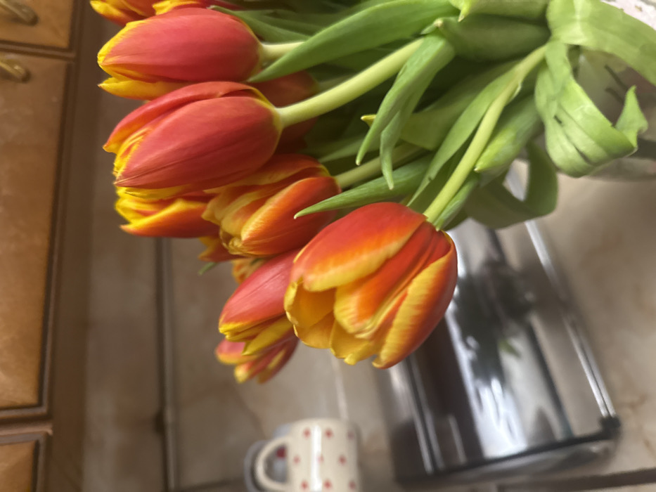 The scene depicts a domestic interior in Kurovskoye, Russia. The primary subject is a dense bouquet of freshly cut tulips, positioned centrally and to the right. The tulips display petals primarily in shades of red and orange, with prominent yellow highlights and stripes, particularly along the petal edges. Their stems are a vibrant green, indicating freshness. The flowers appear to be arranged in a clear glass vase, partially visible at the bottom right. In the blurred background, to the left, a white ceramic pitcher or jug with red polka dots and a handle is visible. Below this ceramic item, a reflective, silver-toned kitchen appliance, possibly a toaster or pasta maker, rests on a light-colored countertop. The background is completed at the top by blurred, light brown wooden or laminate kitchen cabinetry with visible gold-toned handles. No individuals are present in the image, and no specific actions or interactions are depicted. The lighting is consistent throughout the indoor setting.