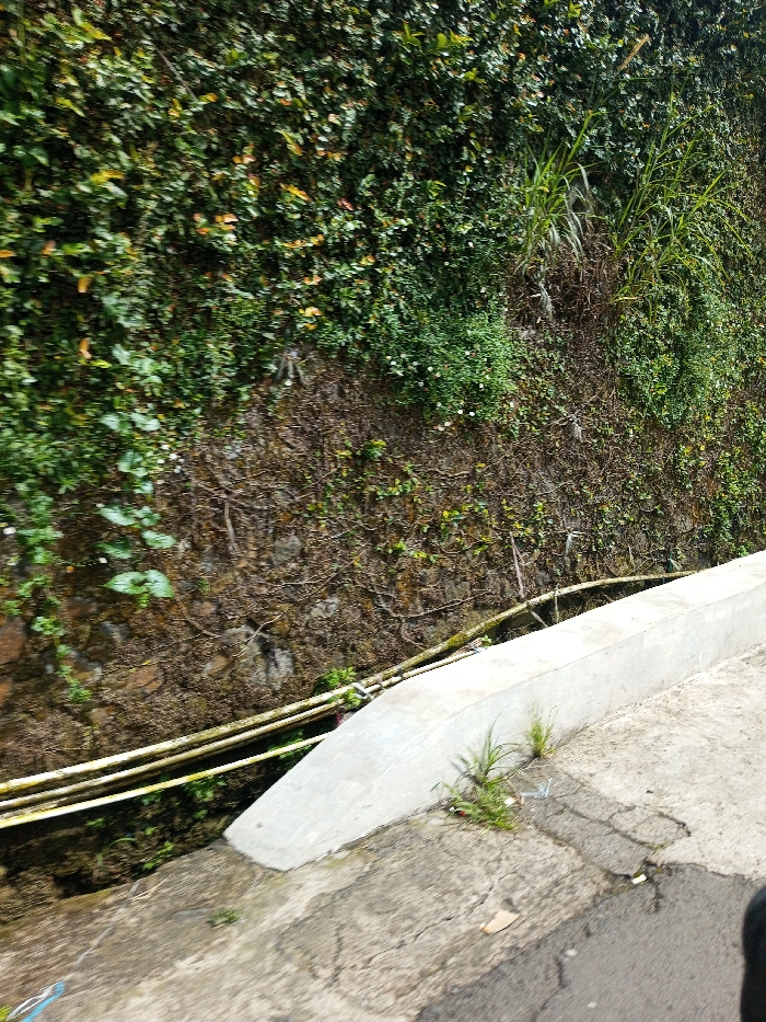 The image displays a static outdoor scene in Kandenuwara, Sri Lanka. The left side is dominated by a vertical embankment or retaining wall, heavily covered by dense green foliage, predominantly climbing plants exhibiting small white flowers. Portions of the dark brown, possibly rocky or earthen, wall are visible where vegetation is sparser, revealing intertwined vine tendrils and individual clumps of taller green grass. At the base of the wall, a narrow, dark channel contains three parallel, light-colored pipes, likely utility conduits. This channel is bordered on the right by a light-grey concrete curb with a sloped top surface. The immediate foreground consists of a dark-grey, paved surface, exhibiting cracks and supporting several small tufts of green grass, particularly near the curb. A piece of light-colored debris rests on the paved surface near the grass. No individuals or active subjects are present within the frame.