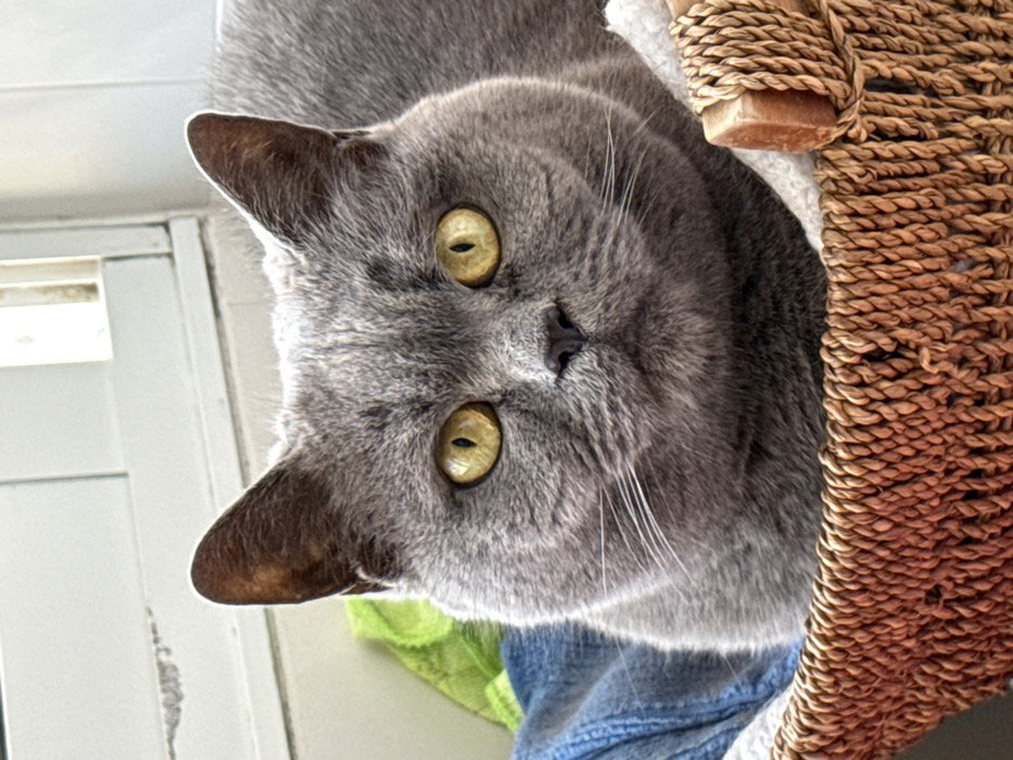 A gray cat with golden eyes looks directly at the camera, its head tilted to the side. The cat is near a woven, cylindrical structure, possibly a cat tree. Part of a white paneled wall is visible in the background. The cat is nestled in a blue fabric, with a hint of green fabric below it. The image is well-lit and focused on the cat's face.