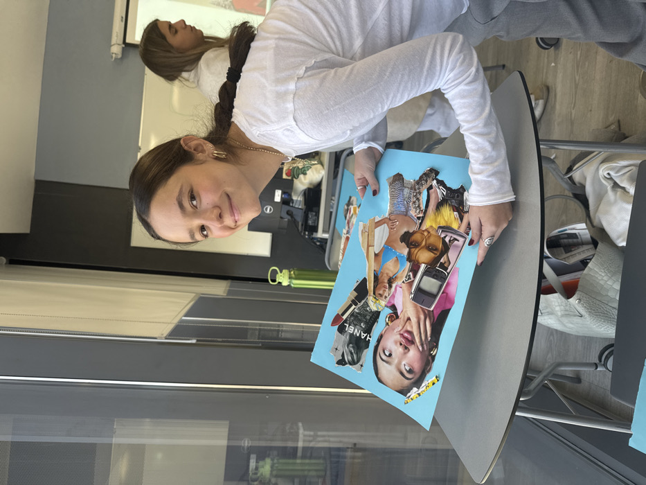 An indoor scene, likely a classroom or art studio, displays a young female subject in the foreground holding a collage