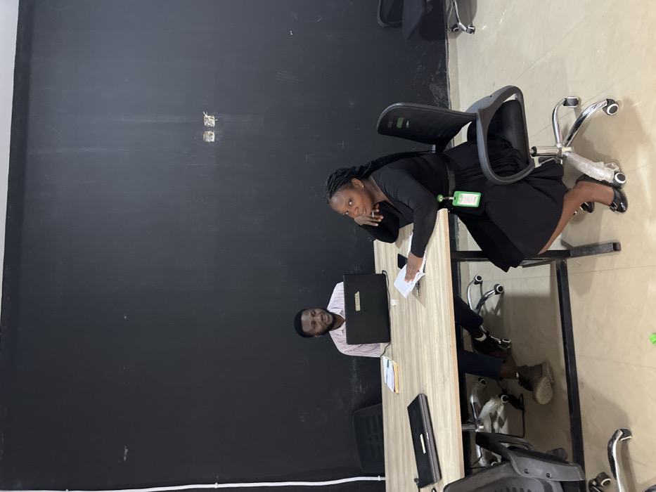 Two people are at a desk. The woman is wearing a black dress and is resting her head on her hand. She has a green lanyard attached to her waist. Papers are on the table, next to her. The man is wearing a striped shirt and is sitting in front of a laptop. A black wall is to their left, and the room appears to be an office space. Other chairs are visible in the background.