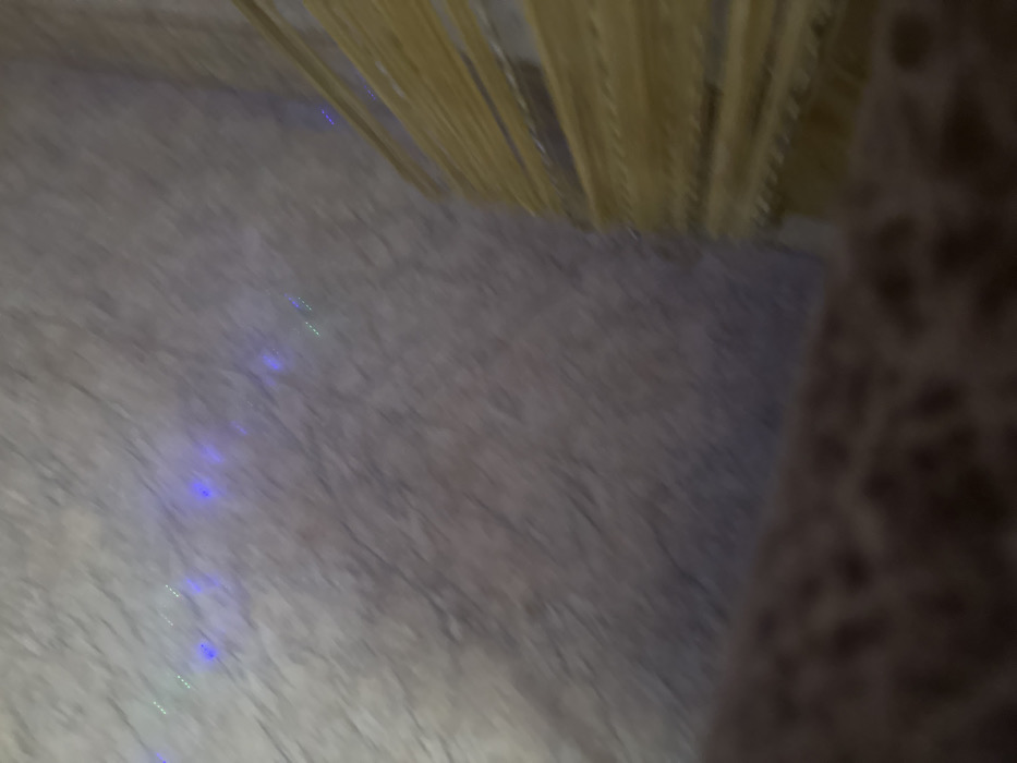 The image displays an indoor scene located in Laminga, Nigeria, characterized by significant motion blur and low light conditions. The lower portion of the frame is occupied by a dark, textured surface, possibly fabric like a blanket or carpet, exhibiting a discernible pattern of small, darker spots. The central and left areas show a light grey-beige wall with a mottled or textured finish. Scattered across this wall are multiple small, illuminated points: several distinct blue lights and fewer, smaller green lights, indicative of decorative string lighting or similar light sources. Along the right side of the frame, numerous thin, elongated, yellowish-beige objects are arranged vertically in multiple parallel bundles or stacks, consistent with uncooked spaghetti or similar pasta. No individuals or specific actions are discernible within the frame; all depicted elements appear static.