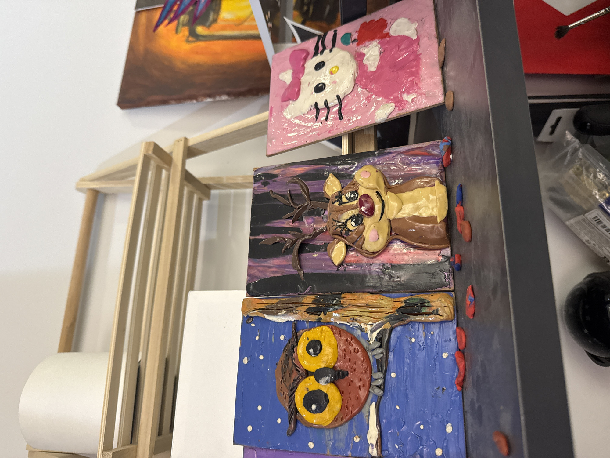 collection of clay artwork displayed on a dark gray, vertical surface, likely part of a display unit. From top to bottom, the visible pieces include: a pink rendering of Hello Kitty, a reindeer or deer with brown and tan clay against a purple and black background, and an owl with yellow eyes and a brown body on a blue background with white dots. The clay figures are three-dimensional and seemingly attached to painted backgrounds. To the left of the artwork, a light-colored wooden easel is partially visible, holding a roll of white paper. Above the easel, other artwork is present, including a painting featuring warm tones of orange and yellow. The presence of art supplies and materials suggests the scene is likely in an art studio or creative workspace. However, no specific information in the image allows pinpointing a location within Batumi, Georgia.