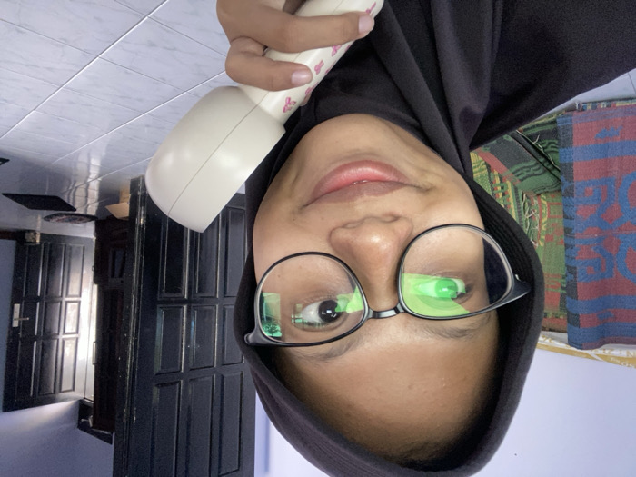 A person wearing glasses and a dark hooded top holds a white electronic device to their head. The background includes a door on the left and a patterned rug on the right. The image is rotated, presenting the person's face at the bottom. A reflection is visible in the lenses of the glasses. The person has a neutral expression.