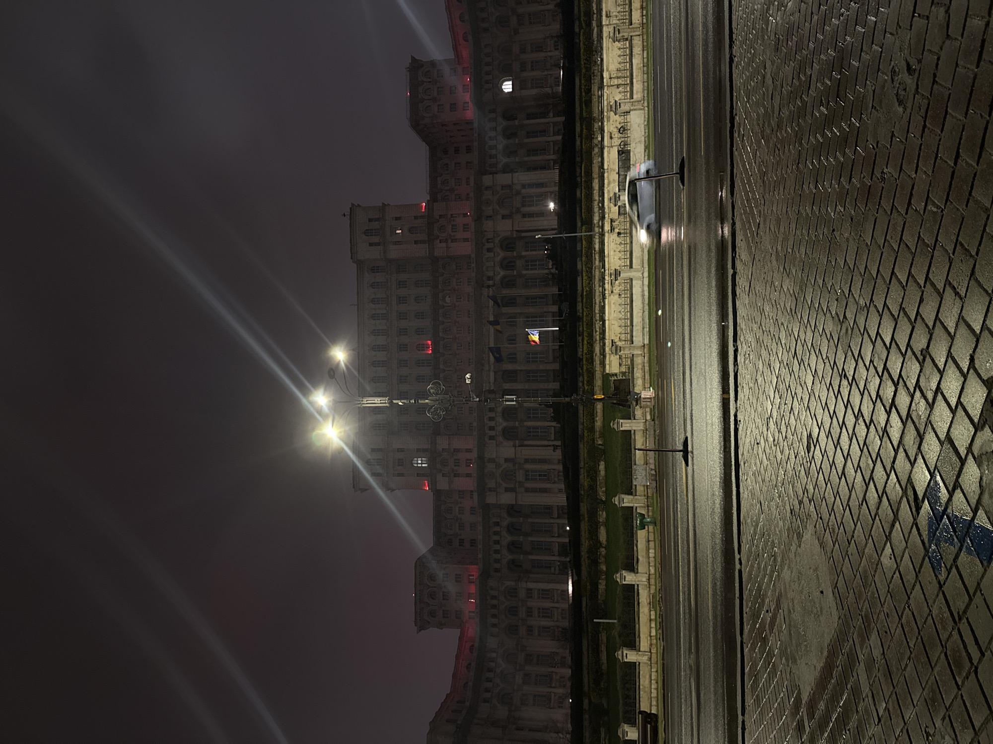The image depicts the Palace of the Parliament in Bucharest, Romania, at night. The building is large and illuminated, with multiple windows and architectural details visible. A Romanian flag is placed near the building. The road is wet, reflecting light from the surroundings. A car is seen on the street. A lamppost is visible and its lights are reflecting in the wet pavement. The pavement is constructed from small paving stones, laid in a diagonal pattern. The sky is dark, suggesting a nighttime setting.
