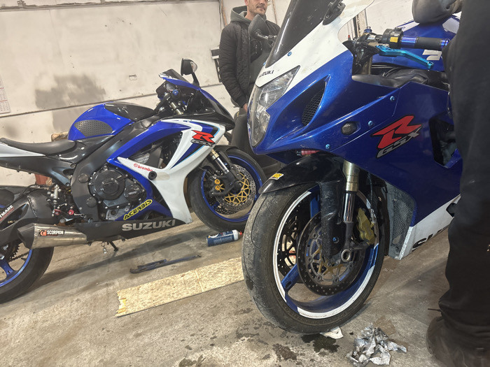 The image depicts an indoor workshop or garage setting in Dimitrovgrad, Bulgaria; however, the precise location within the city cannot be determined from the visual information. Two sport motorcycles, both Suzuki GSX-R models, are positioned on a stained concrete floor. In the foreground on the right, a blue and white Suzuki GSX-R is prominent, with its front wheel featuring blue and white rim tape. Gold-colored brake calipers are visible on the front wheel assembly. Blue aftermarket levers are installed on the handlebars. Crumpled white paper or rags and a spray can are present on the floor directly in front of this motorcycle's front wheel. The lower legs and feet of a person, clad in dark pants and shoes, are partially visible standing next to this motorcycle on the right side of the frame. In the background on the left, a second blue and white Suzuki GSX-R stands on a kickstand. This motorcycle features a black fuel tank with blue accents, a white tail section, and a "SCORPION" aftermarket exhaust system. "ACERBIS" and "SUZUKI" decals are visible on its lower fairing. Its front wheel shows gold-colored brake discs. A male individual is standing between and slightly behind the two motorcycles, wearing a dark hooded jacket. Only his upper torso and head are visible; he possesses a beard or stubble and appears to be observing the scene. The walls of the space are light-colored, possibly unpainted or worn, with a calendar or similar document affixed to the far wall. Several wrenches or tools are lying on the floor between the two motorcycles. The overall environment suggests a motorcycle service or repair area.