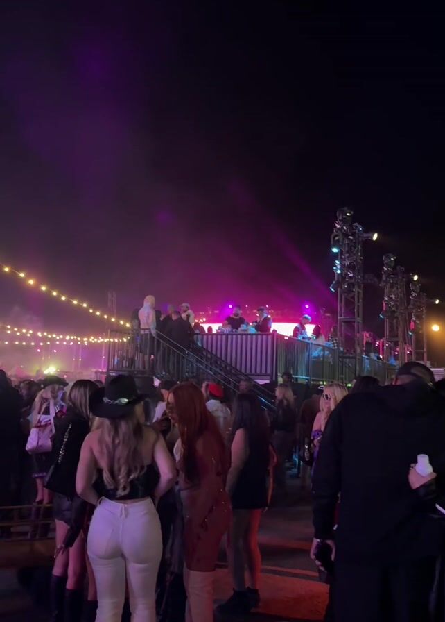 crowd of people at a nighttime outdoor event, seemingly a concert or festival. In the center of the frame, a raised platform serves as a stage, with figures silhouetted against bright lights, presumably performers or DJs. The stage is flanked by light towers and illuminated by a purple-hued light that fills the upper portion of the frame. String lights are visible in the background, adding to the festive atmosphere. The crowd, which appears mostly female, is dressed in casual, trendy clothing, with several individuals wearing cowboy hats. People are walking, talking, and observing the performance on stage. The camera remains mostly static, capturing the energy and excitement of the event.