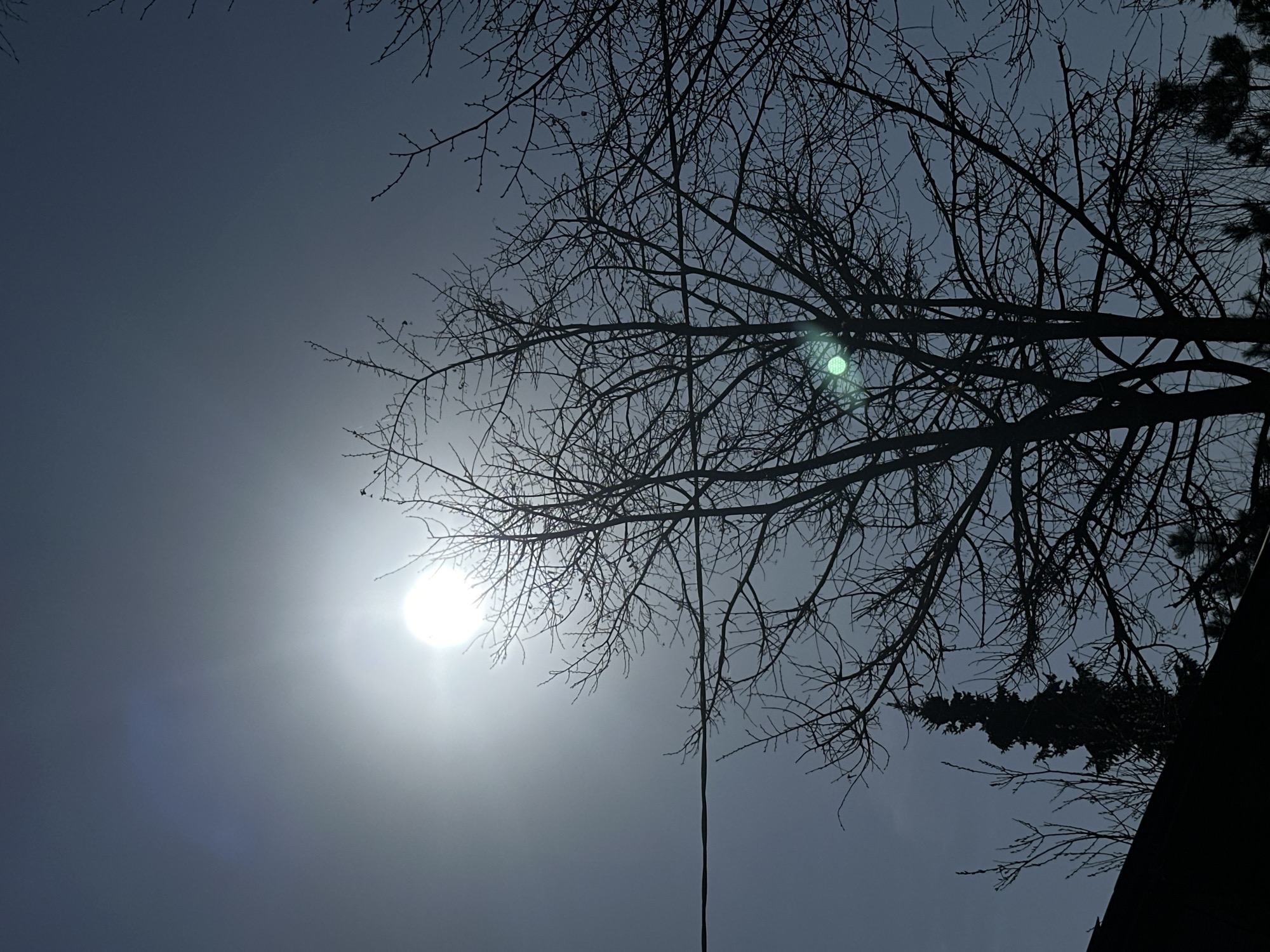 The image depicts a view looking up into the sky, dominated by the silhouette of a bare tree