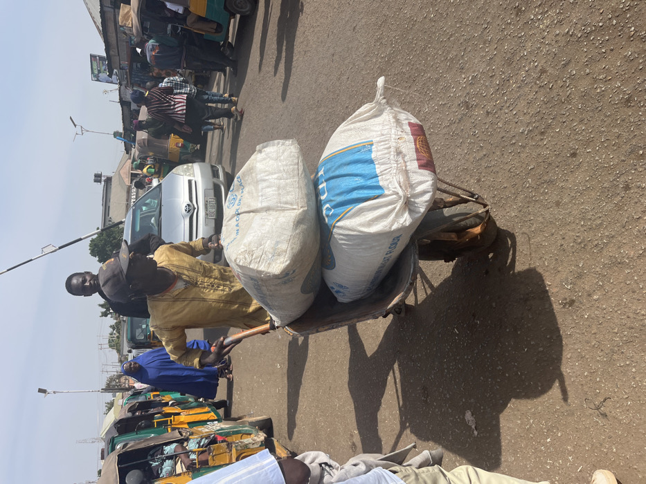The image depicts a bustling street scene in a commercial area of Jos, Plateau State, Nigeria, characterized by human activity, various vehicles, and evident commerce. In the foreground, a dark-skinned man wearing a yellow long-sleeved tunic and a dark baseball cap pushes a grey metal wheelbarrow. The wheelbarrow is heavily loaded with two large, rectangular white sacks. The bottom sack has blue and white markings with text partially visible as "WHEAT FLOUR." The top sack features text that includes "KEEP IN A COOL DRY PLACE." The man's hands are gripping the wooden handles of the wheelbarrow. To the immediate left of the main subject, a light-skinned person in a light blue short-sleeved shirt and khaki trousers is partially visible. Further left, a row of yellow and green auto-rickshaws (Keke Napep) is parked or moving slowly. One Keke Napep has passengers. A woman in a vibrant blue full-length hijab walks behind the Keke Napeps. In the middle ground, a silver Toyota SUV, with a visible Nigerian license plate (RSC-187TJ, indicating Plateau State registration), is stationary or moving slowly. Behind the SUV, another dark-skinned man in a dark shirt is visible, looking towards the right. The background shows more pedestrians, including individuals wearing striped shirts and traditional attire, moving along the street. Several other Keke Napeps and commercial buildings line both sides of the road. Overhead, utility poles with crossbars and wires are visible, along with a street light. The sky is clear with a slight haze. Strong sunlight casts distinct shadows on the paved, somewhat worn asphalt road.