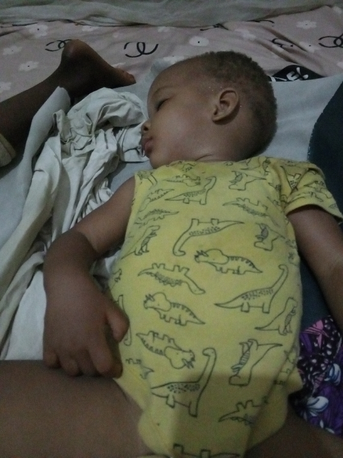 The image, taken in Markurdi, Nigeria, depicts a young child asleep on a bed in an indoor environment