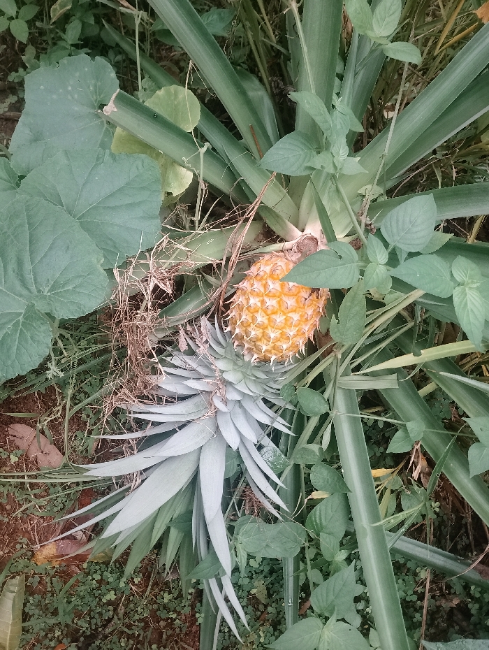 A ripening pineapple is nestled within its leafy, spiky plant. The fruit is a vibrant yellow-orange, contrasting with the green and silver hues of the leaves. Surrounding the pineapple plant are various other green plants, including broad-leafed foliage. Dried plant debris and small weeds dot the ground beneath, indicating a natural, perhaps untended, environment. The image captures a scene of organic growth and natural textures.