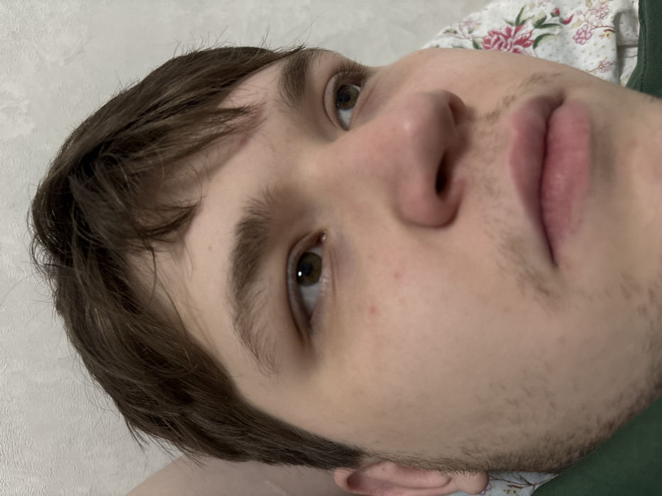 A close-up, slightly angled portrait of a young man with light skin, brown hair, and brown eyes. He has full lips and a prominent nose. Light stubble is visible on his chin and upper lip. The background consists of a white wall and a floral patterned fabric, possibly a pillowcase or sheet. He appears to be lying down looking upwards towards the camera.