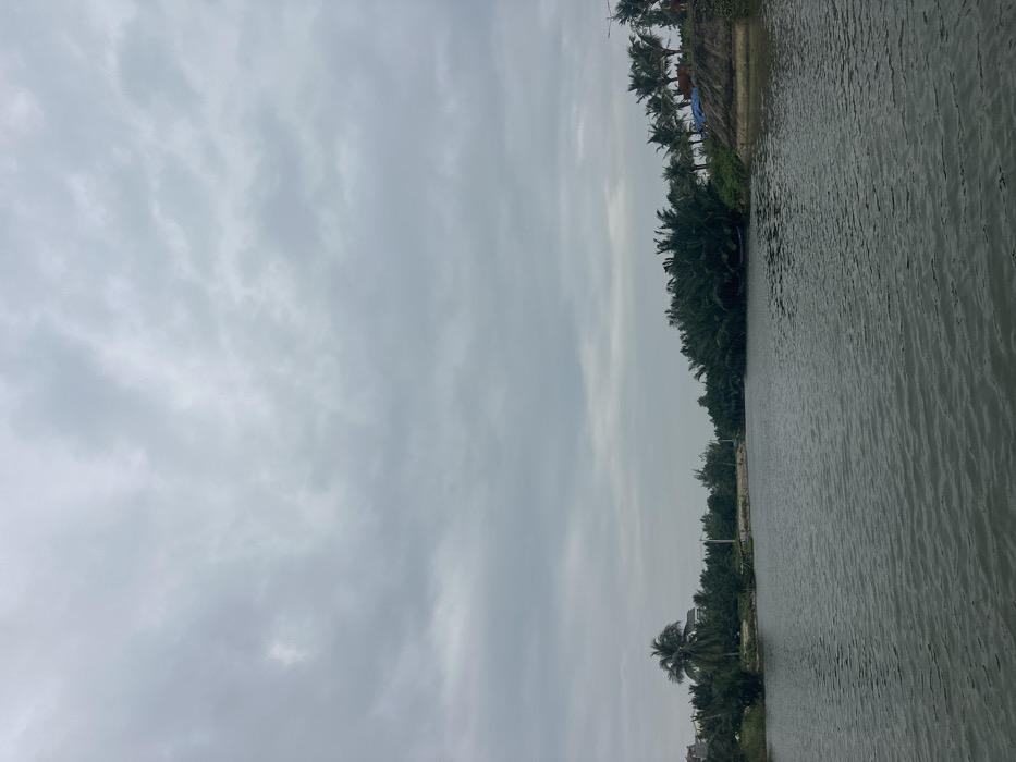 A body of water occupies the right half of the frame, its surface reflecting the overcast sky. A dense line of trees, including palms, runs along the water's edge, separating it from a gray sky filled with layered clouds. A structure with blue tarps is visible behind the trees in the upper right corner. The overall impression is one of tranquility despite the gloomy weather.