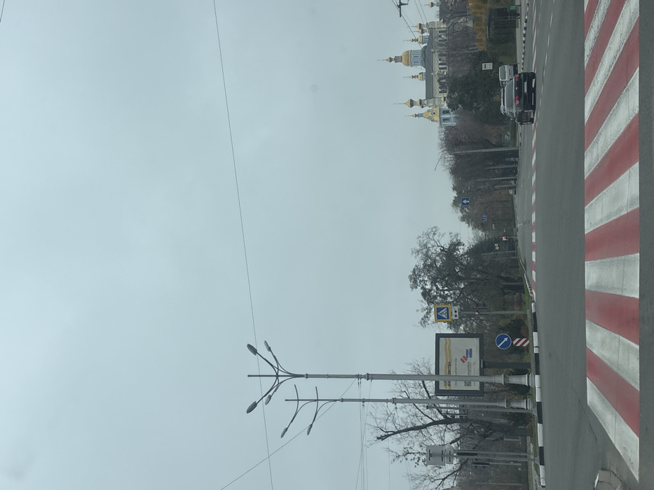 The image displays an urban street scene in Kharkiv, Ukraine, on an overcast day
