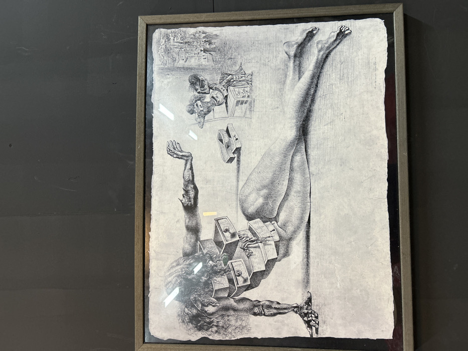 Framed surreal artwork depicts a male figure seemingly suspended upside down