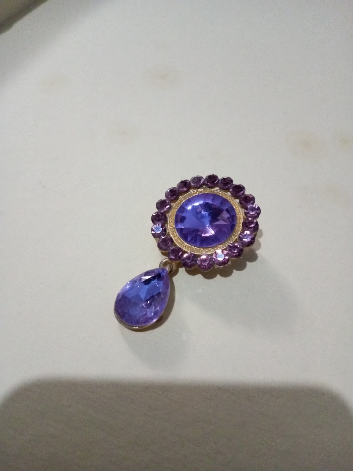 A jewelry piece rests on a light-colored surface. It features a large, oval, purple gemstone encircled by smaller, round, purple stones and set in gold. A teardrop-shaped, purple gem hangs below, also set in gold. The arrangement creates a pendant-like appearance, possibly for an earring or brooch. Shadowing indicates the light source is above the jewelry.