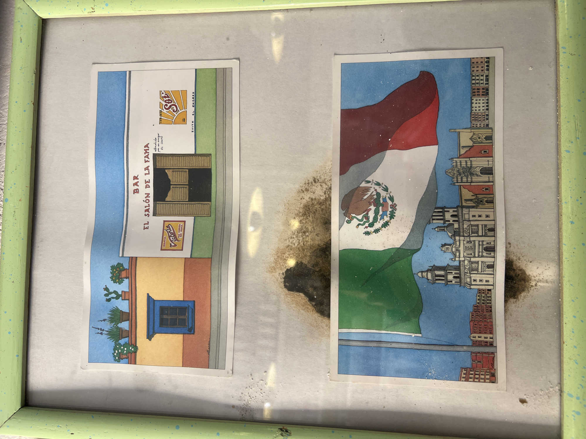 The image displays a light green, speckled wooden frame containing two distinct, stylized illustrations mounted on a white backing material. The top illustration depicts the exterior of a bar named "BAR EL SALÓN DE LA FAMA." The building facade features a yellow section with an orange base and a blue-framed window on the left, topped with potted plants including succulents and flowering species. The right section is a white facade with a light green base, featuring brown double saloon-style doors. Signage includes a yellow and orange "CERVEZA Victoria" sign with "MAS SABROSA QUE NUNCA" text on the left, and a yellow and orange sunburst "CERVEZA Sol" logo with "EVITA EL EXCESO" text on the right. Additional handwritten text states "atendido por su amigo EL CHATO." The artist's signature, "Marán," is visible in the lower-left corner of this illustration. The bottom illustration features a large Mexican flag, with its green, white (bearing the national emblem), and red vertical stripes, flying from a gray flagpole against a blue sky. Below the flag, a detailed cityscape is visible, prominently featuring two colonial-style churches with multiple towers and domes, identifiable as the Parroquia de San Andrés Apóstol and the Ex-Convento de San Gabriel Arcángel. These religious structures are surrounded by various multi-story residential and commercial buildings. The white backing material exhibits significant brown and black discoloration, consistent with mold or water damage, particularly concentrated between the two illustrations and extending downwards on the lower-left side. White particulate matter, likely dust or debris, is scattered across the backing and along the internal edges of the frame. The overall presentation suggests aging and environmental exposure. The specific architectural landmarks depicted in the bottom illustration confirm the location as the city of San Andrés Cholula, Puebla, Mexico.