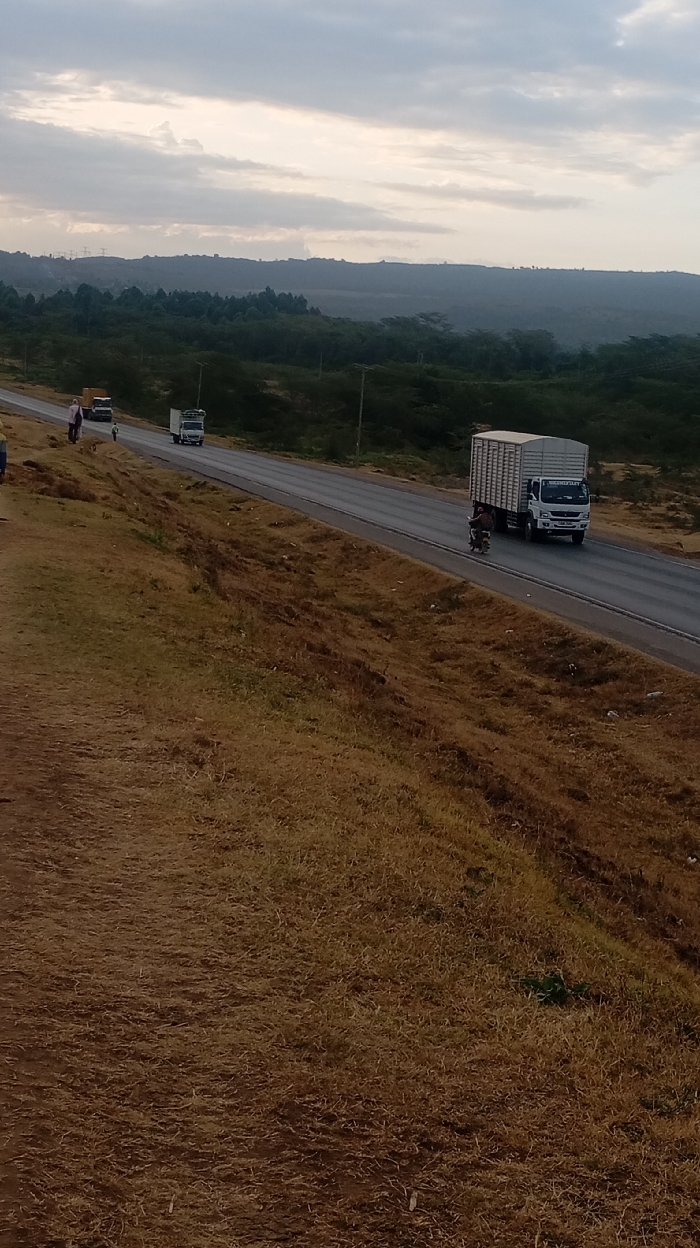 A long asphalt road stretches through a dry, grassy landscape under a cloudy sky. Three trucks are visible on the road, with the closest one being overtaken by a motorcycle. A few people are standing on the grassy verge beside the road. Hills and trees can be seen in the distance. The dominant colors are brown and green, reflecting the dry vegetation and distant foliage.