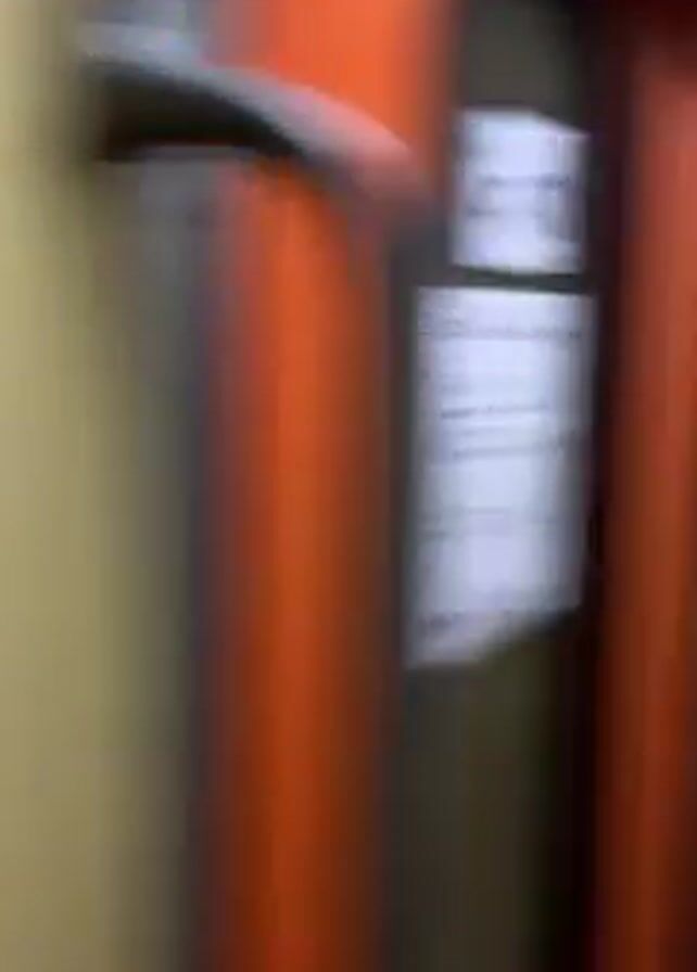 inside of a train car. The camera moves through a hallway with doors on one side and windows on the other. A fire extinguisher is visible in a small compartment near an orange door. The hallway is lit by overhead lights. The doors appear to lead to compartments, and the windows look out onto the passing scenery. The floor is red.