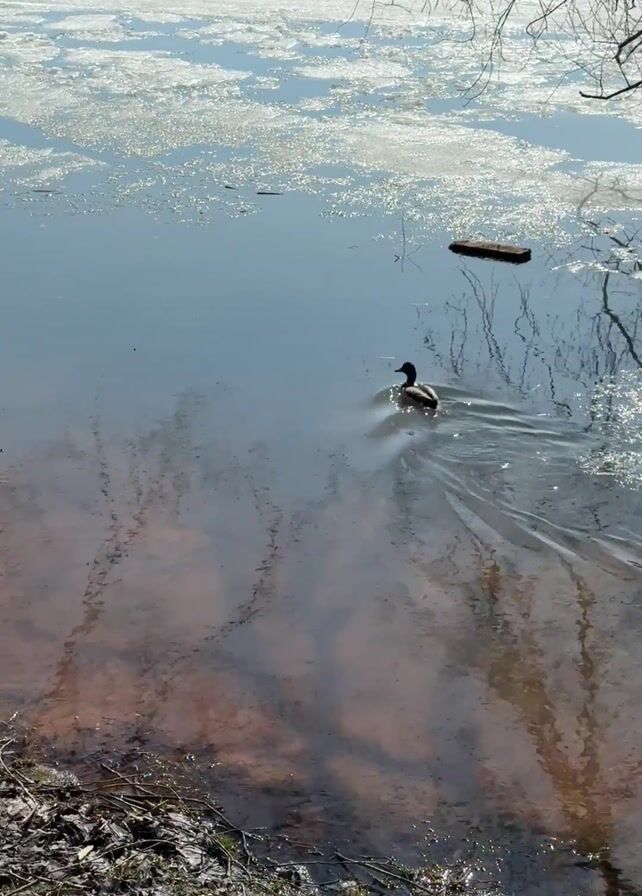duck swimming in a lake on a sunny day. The lake is partially covered with ice, and the shoreline is lined with trees and leaves. The duck is swimming towards the ice, leaving a trail in the water. There is also a piece of wood floating in the lake. The camera is stationary, and the shot is slightly overexposed.