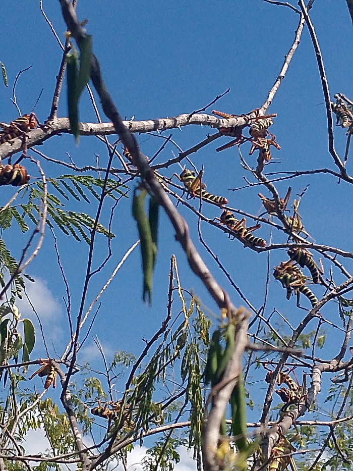 This image, taken in Juan Griego, Venezuela, displays a high-angle view upwards into a tree canopy against a bright blue sky with scattered white clouds. Numerous large insects, identified as locusts or large grasshoppers, are densely perched on the tree's bare, brown branches. The insects exhibit distinct yellow and black horizontal stripes on their abdomens and legs, with reddish-brown thoraxes and heads. The branches are thin and appear somewhat thorny. Several clusters of small, green, elongated leaves are visible, primarily in the lower-left and central portions of the frame. Additional blurred green, pod-like structures are present in the foreground, suggesting close proximity to the lens. No human subjects or their direct interactions are present.