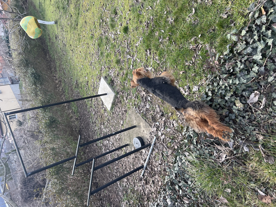 This image captures an outdoor scene in a backyard or garden in Krasen, Bulgaria, during daytime with clear weather. The central subject is a medium-sized dog, likely a terrier breed with black and tan fur, depicted mid-jump. The dog's body is horizontally extended, with its rear legs launching from an ivy-covered patch of ground towards a short, green grassy area. To the left and rear of the dog, three black metal exercise bars, possibly for dips or parallel bar exercises, are visible. These bars are of varying heights and widths, with horizontal handrails supported by angled vertical posts anchored into rectangular concrete bases. A single black circular weight plate rests on the concrete base of the lowest set of bars. The ground surrounding this equipment consists of bare soil covered with scattered dry leaves and sparse grass. In the upper right portion of the image, further into the grassy backyard, a large, yellow and green mushroom-shaped decorative object on a white stalk is prominently positioned. The background reveals a sloping landscape with dense, mostly leafless bushes and trees. A light-colored residential building with visible windows is partially obscured by the distant vegetation on the horizon. The scene is illuminated by strong natural light, casting subtle shadows.