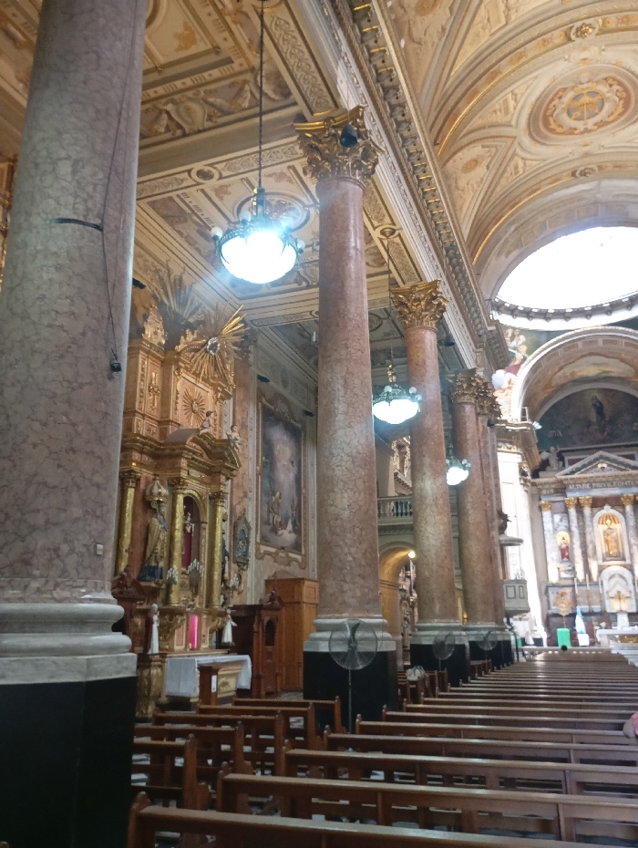 The interior of a grand church features rows of wooden pews leading towards an ornate altar. Tall, marble columns with gilded capitals line the nave, supporting an elaborately decorated ceiling with a central dome. Chandeliers hang from the ceiling, illuminating the space. Artwork and sculptures adorn the walls, creating a sense of historical and religious significance.