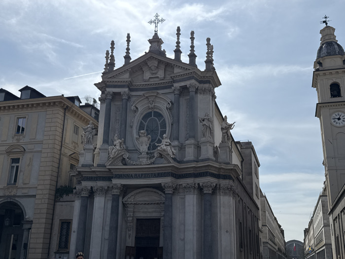 The image displays an urban architectural scene in Turin, Italy, specifically on Piazza San Carlo. In the foreground, the ornate, gray Baroque facade of the Chiesa di Santa Cristina is prominently featured, characterized by its central portal, monumental columns, pilasters, and a large oval window above the entrance. The facade is adorned with numerous statues of saints and angels, along with decorative urns and a central cross topping the pediment. An inscription on the entablature reads "JOANNA BAPTISTA REGIS MED MATER". To the immediate right of the church, a tall, light-colored bell tower, belonging to the adjacent Chiesa di San Carlo Borromeo, stands with a visible clock face displaying approximately 11:25. This tower features an octagonal domed top and a weather vane. To the left of the church, a multi-story classical building with rectangular windows and a dark roof is visible. The background shows a partially cloudy sky with a faint aircraft contrail. Further down the street to the right, other buildings line an urban thoroughfare. No distinct individuals or specific actions are clearly discernible in the scene.
