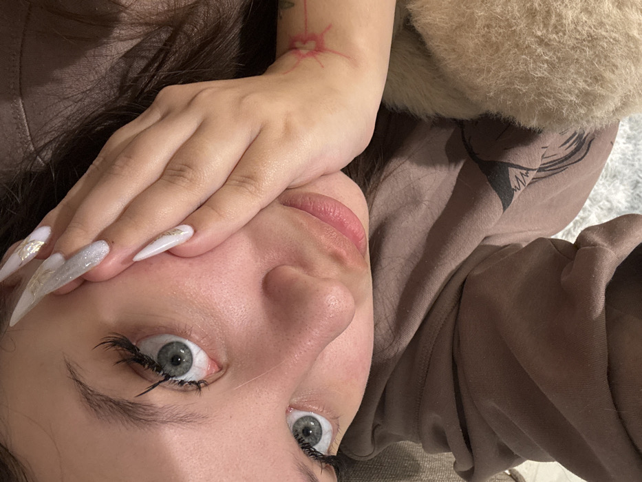 The scene is an indoor setting in Kiryat Motzkin, Israel. The image presents an overhead, close-up view of an individual lying supine. The person's face, upper torso, and left arm are visible. The individual has fair skin, wide-open light blue/grey eyes with prominent dark eyelashes, and full pink lips. Dark hair is visible around the head. The left hand is positioned against the lower left side of the face, with long, pointed fingernails adorned with white polish, glitter, and gold leaf accents. A red/pink sunburst-like tattoo is visible on the inner left forearm. The individual is wearing a brown or taupe-colored hooded sweatshirt with a dark graphic design on the front. The immediate environment includes a light-colored, textured, possibly fluffy surface beneath the individual and a beige furry object near the upper left of the frame. A brown textured surface is visible along the right edge of the frame.