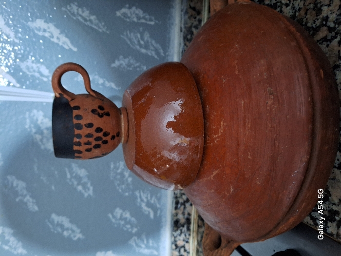 A three-tiered stack of terracotta items is centered on a speckled dark grey and white countertop. The base is a large, unglazed, reddish-brown terracotta pot, equipped with a domed lid and two small, looped handles. An inverted, smaller, glazed reddish-brown terracotta bowl rests atop the pot's lid, exhibiting a glossy, reflective surface. Crowning the stack is a small, unglazed terracotta cup, colored reddish-brown with a black rim and scattered black dot patterns, featuring a single C-shaped handle. The background displays a light blue wall with a subtle, repeating pattern of lighter abstract shapes, along with a vertical white strip on the right. The depicted scene is located within the city of Moguer, Spain.