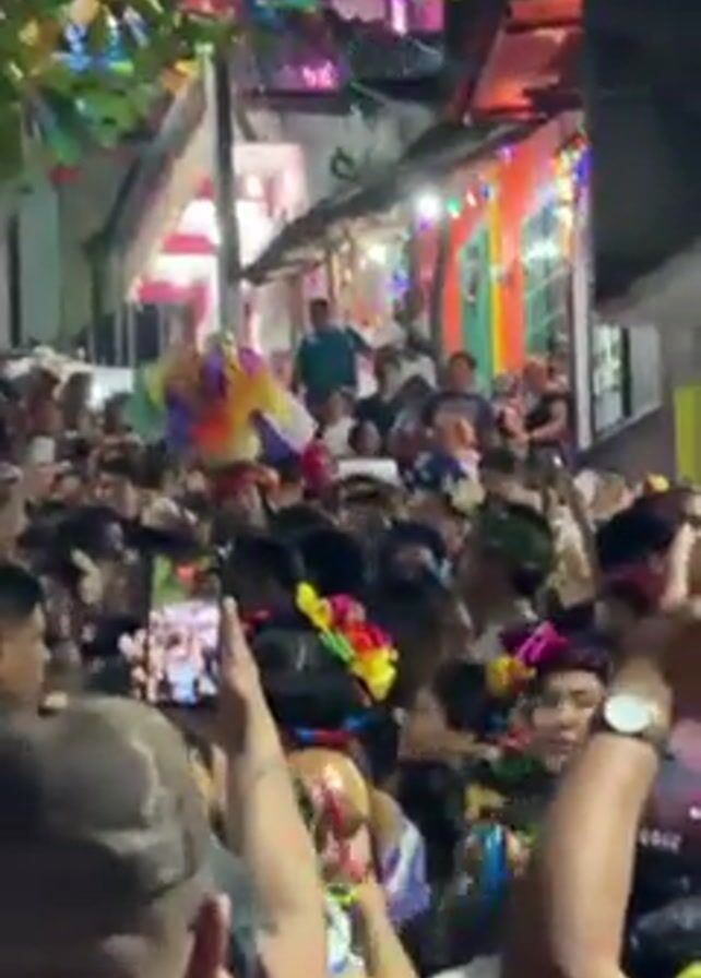 The video depicts a dense crowd of people gathered in a narrow street, likely celebrating or participating in a local event