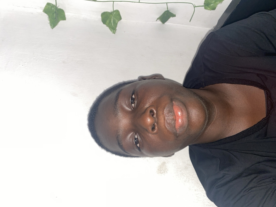 A young person with dark skin and short hair faces the camera. They have a rounded face, small nose, and full lips. The person wears a black t-shirt. The background features a white wall with artificial green leaves hanging across the top. The photo is taken indoors with some visible shadows, giving the picture a casual, slightly candid appearance.
