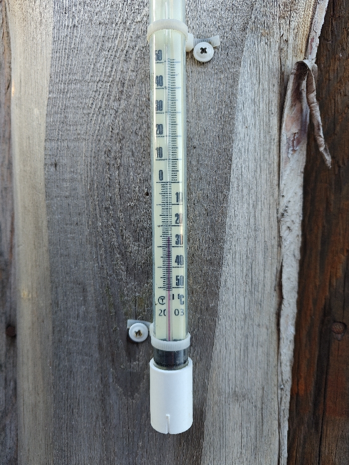 - "A clear glass tube thermometer is vertically mounted on a weathered wooden surface in Nizhnyaya Gar', Russia" by FM-LxGEp1, licensed under CC BY 4.0