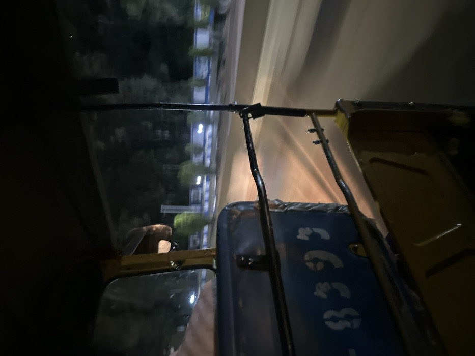 Captured from inside a moving vehicle at night, the view includes the vehicle's frame with metal bars and a section of a blue seat with white numbers "8393