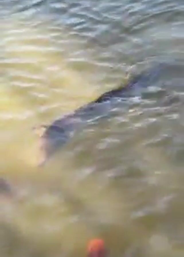 The video depicts a murky body of water where a large, dark fish swims among several smaller, orange-colored fish. The water appears to be shallow and slightly disturbed, with small ripples on the surface. The larger fish is the primary focus, its elongated body moving through the water, while the smaller fish dart around it.