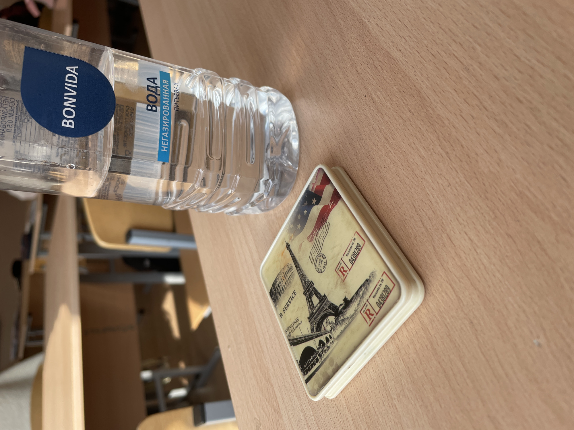 clear plastic water bottle labeled "BONVIDA," with the word "ВОДА" (water) and "НЕГАЗИРОВАННАЯ ПИТЬЕВАЯ" (non-carbonated drinking) printed on the label in Russian. The bottle is lying horizontally on a light-colored wooden surface. Next to the bottle is a small, square souvenir with a vintage design, including the Eiffel Tower, the Colosseum, and an American flag. The souvenir features stamps with the code "R 04381289" and the inscription "Varsavia tx. 78". A background view shows partially visible chairs.