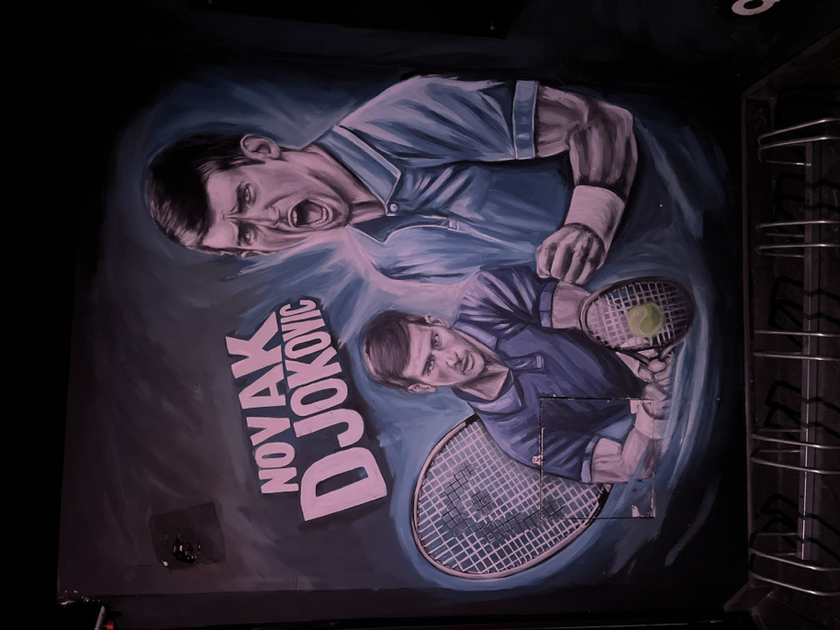 - "A mural painted on a dark blue wall in Sofia, Bulgaria, depicts two stylized portraits of tennis player Novak Djokovic" by FM-NEsdl2, licensed under CC BY 4.0