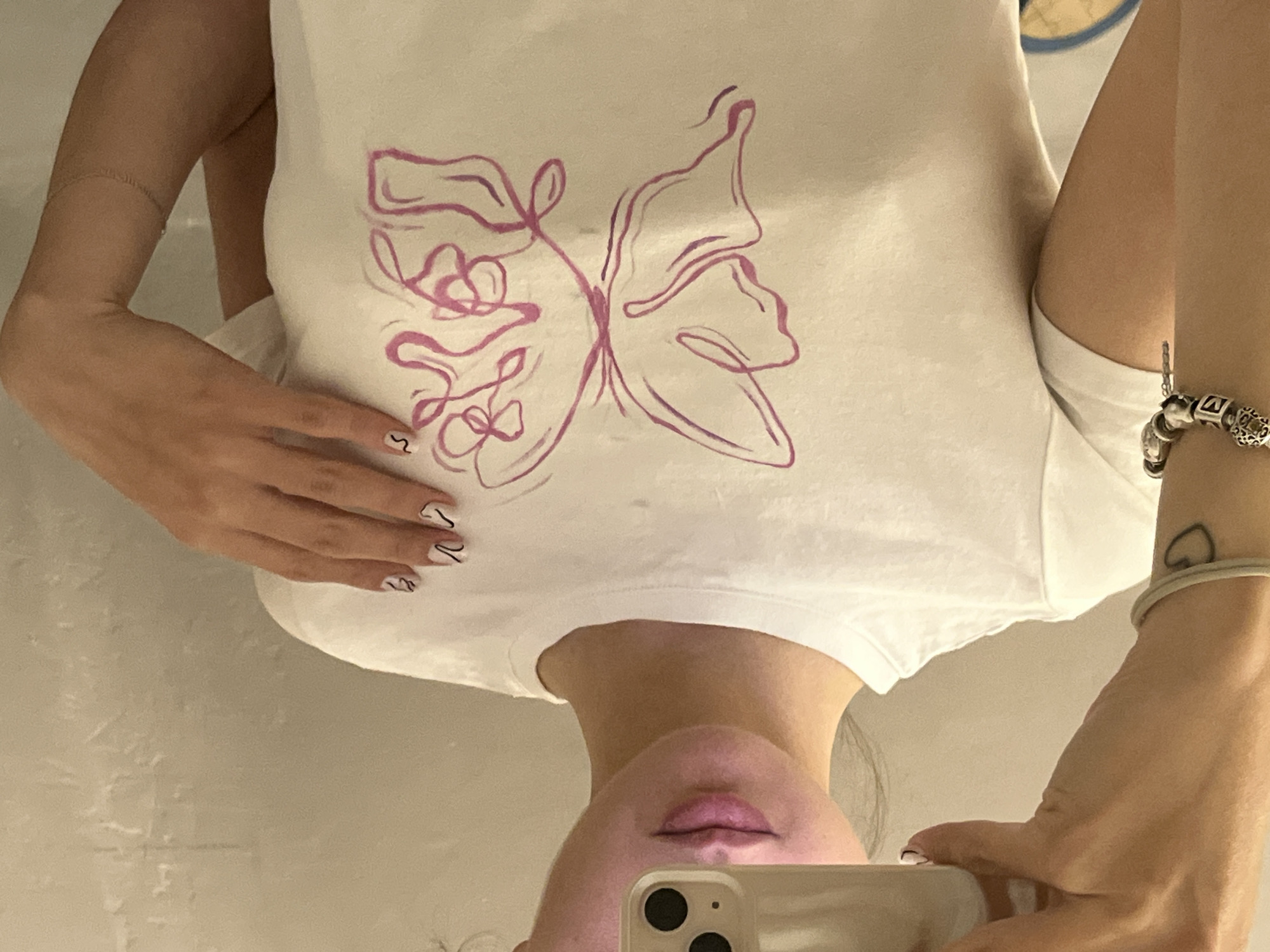 A person takes a selfie in front of a mirror. The person is wearing a white T-shirt with a butterfly print on the front. The person has fair skin and light-colored hair, a silver bracelet with charms on their right wrist, and fingernails painted with white polish and black stripes. A heart tattoo is on the right wrist. The background is blurred. There is not enough information to confirm that the image was taken in Saarbrücken, Germany.