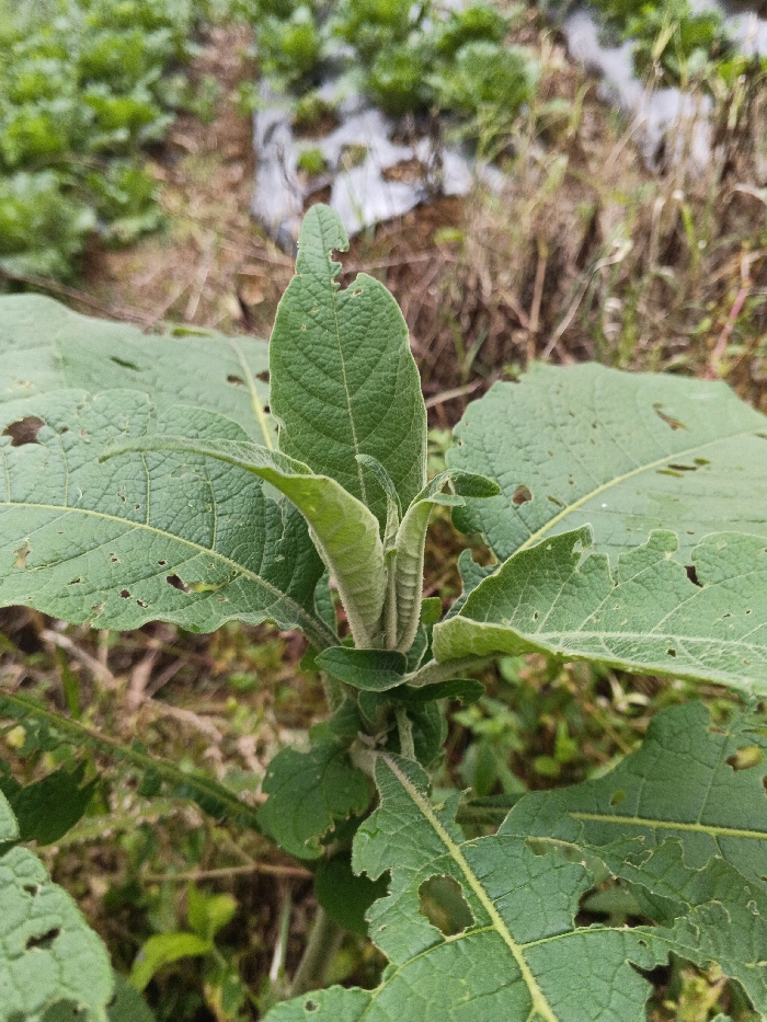The image captures a close-up, vertical view of a green herbaceous plant, likely a weed or young crop, in an agricultural setting located in Pinnwe, Myanmar (Burma). The plant features broad, ovate leaves with prominent venation, several of which display irregular perforations and marginal damage consistent with insect herbivory. The uppermost leaves are lighter green and appear to have a fine, fuzzy texture. The background, rendered out of focus, reveals rows of smaller green vegetation, areas covered with light-colored plastic sheeting, and sections of dry earth and sparse grass, indicative of a cultivated field. Natural daylight illuminates the scene.