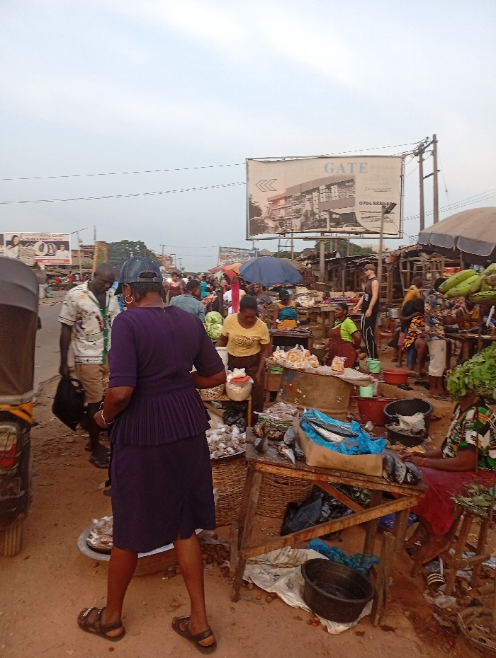 A bustling marketplace scene unfolds with vendors displaying their goods. Fish are prominently featured on a makeshift wooden table, alongside various food items in baskets. A woman in a purple dress stands in the foreground. In the background, a billboard with "GATE" written on it overlooks the market. The sky is overcast. Numerous people mill around, creating a lively atmosphere.