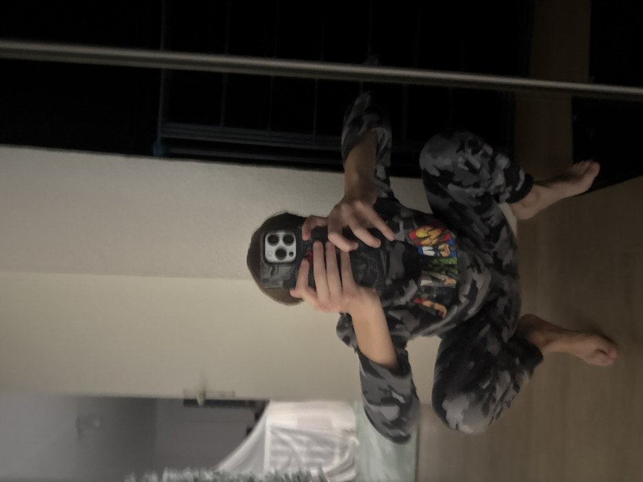 A person in gray camouflage pajamas holds a phone, taking a selfie in a mirror. The reflected background reveals a bedroom with a made bed. A metal rail runs across the top of the mirror. The person's face is obscured by the phone. Their feet are visible to the right. The pajamas feature a cartoon design on the torso.