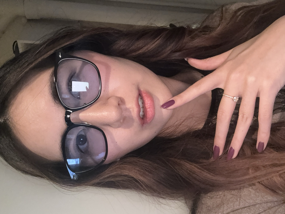 A close-up portrait depicts a single female individual in an indoor setting located in Paris, France. The woman has long, wavy dark brown hair and is looking directly at the camera. She wears thick-rimmed black eyeglasses with reflective, light-filtering lenses. Her lips are slightly parted, revealing a hint of teeth, and are colored with a reddish-pink tint. Her left hand is positioned with the index finger touching the area below her lower lip. All visible fingernails are painted a deep plum color. A gold-colored ring featuring a clear, prominent central stone surrounded by smaller stones on the band is worn on the ring finger of her left hand. She is dressed in a light brown garment layered over a dark, possibly black, top with a lace or patterned neckline visible on her chest. The background is out of focus, appearing as a plain, light-colored interior wall or surface.